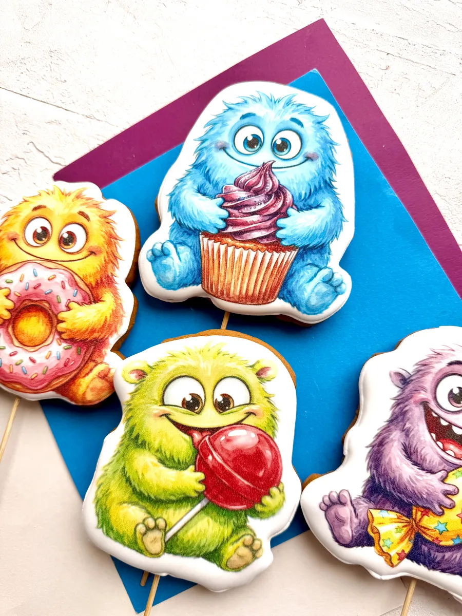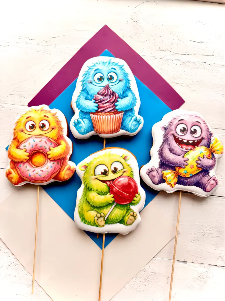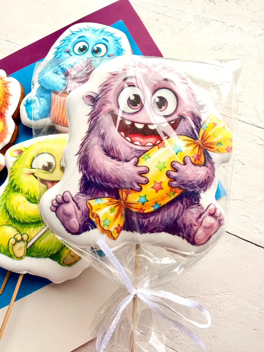 Монстрики выглядят очень эффектно и невероятно мило. Это съедобное украшение на торт обязательно понравится любому ребенку. Если вы хотите сделать что-то особенное для вашего сына, украсьте торт пряниками с изображением милых монстриков. Это будет не только оригинальным дополнением к вашему торту, но и приятным сюрпризом для гостей. Кроме того, такие пряники на палочке станут ярким украшением вашего праздничного стола и понравятся как детям, так и взрослым. Имбирные пряники на торт с днем рождения - это идеальное лакомство для детского праздника или сладкого стола в садик. Топперы в форме монстриков - оригинальная вкусняшка для детей и очень интересный подарок на День рождения. Расписные пряники для торта подходят как на один 1 годик малышу, так и на День рождения мальчика на 2 года, 3 года, 4 года и 5 лет. Порадуйте свою маленького брата, или племянника, или крестника, внука этим вкусным набором сладостей. Праздничные пряники имеют натуральный состав и изготовлены нашими кондитерами вручную. Каждый пряник упакован в индивидуальный герметичный пакет, что гарантирует его свежесть.